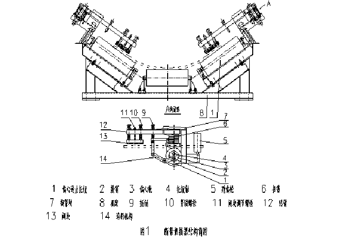 下斷帶保護裝置(見圖2)主要有逆止托輥2、平行托輥9、偏心逆止托輥6、制動連桿5、撥桿4等組成,偏心逆止托輥內(nèi)裝有偏心輪6、制動輥軸8及偏心輪傳動機構(gòu),逆止托輥裝有撥銷輪3及傳動機構(gòu)。