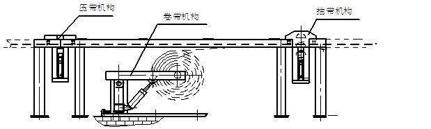 2、  啟動拉緊機構進行松繩,拉緊小車同時送開皮帶。開啟抽帶機構的液壓馬達驅動固定輥,使其順時針旋轉,通過固定輥和活動輥的摩擦力將皮帶滾出,使皮帶在壓帶機構和抽帶機構之間縮曲,用剪刀剪斷,將皮帶斷頭安裝在卷帶機上。